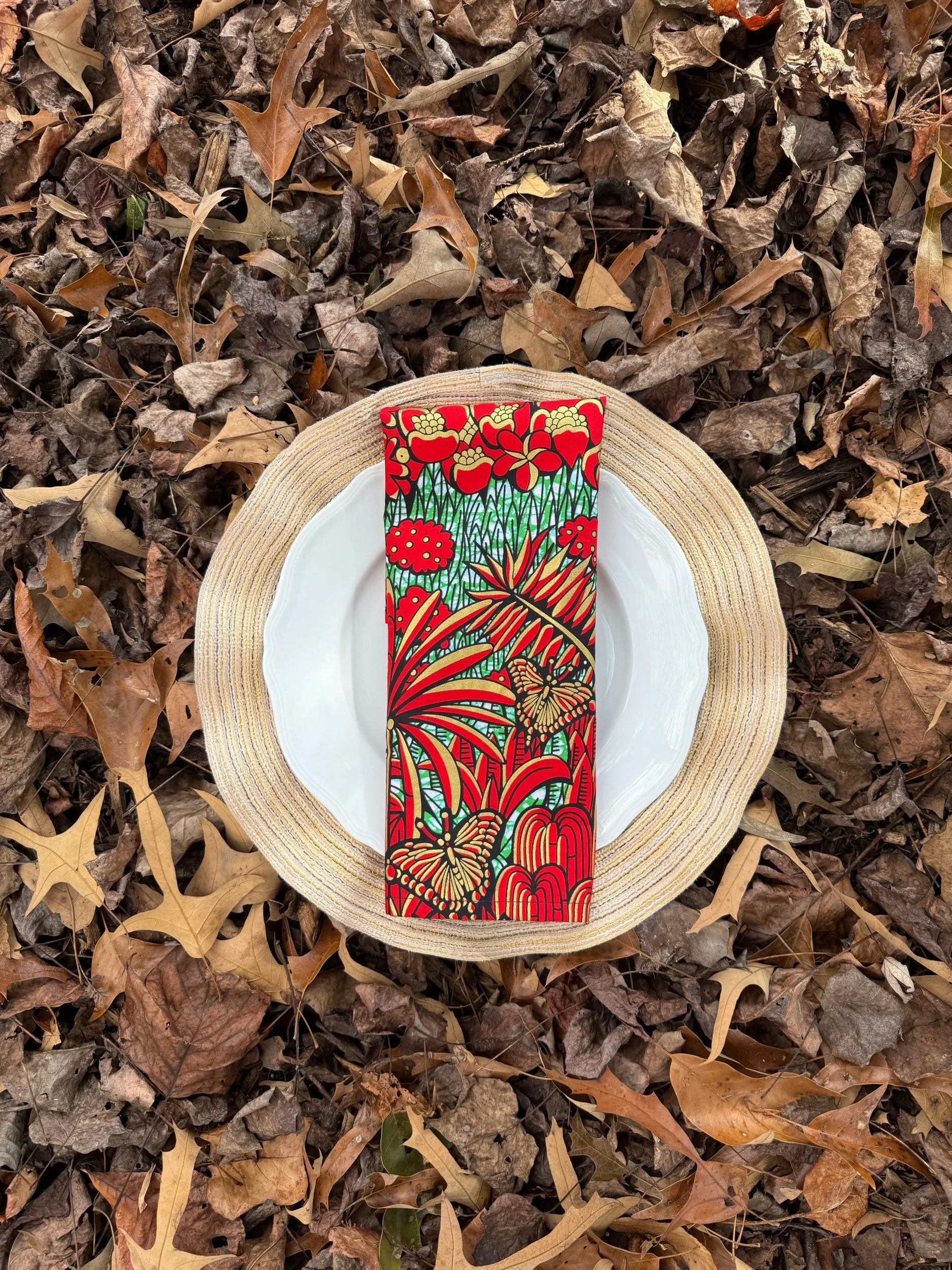 Set of four 100% cotton African wax print, 18” x 18” square napkins. Sewn by Fatima, an Afghan woman in the Afghan Women’s Collective who is building a new life with her family in Asheville, NC. She is paid a fair wage for the piecework she produces and has flexibility to sew on her own schedule, in her own home.